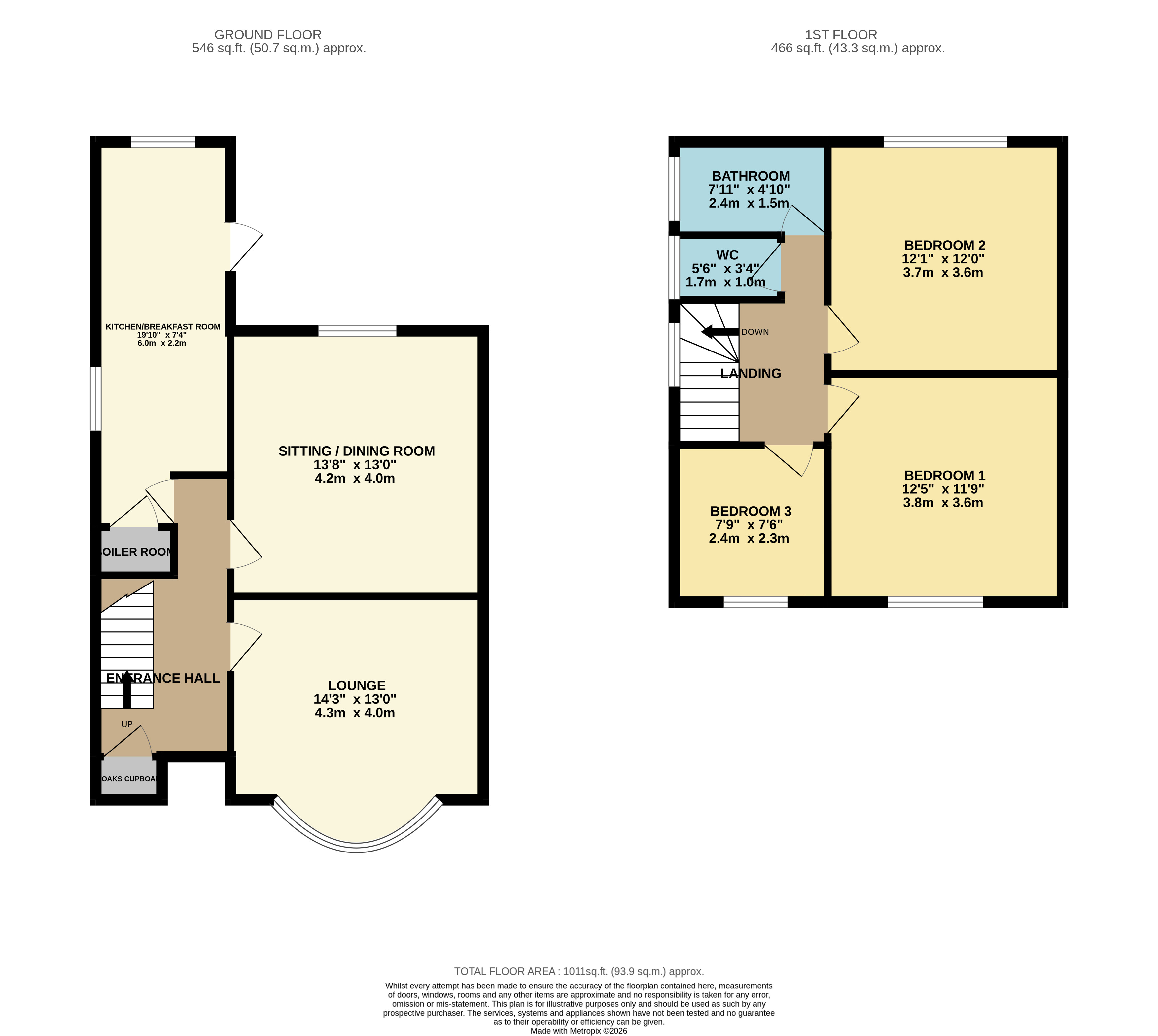 To the first floor are three bedrooms, two of which are generous doubles (the principal bedroom enjoying distant views), together with a contemporary family bathroom fitted with a modern white suite comprising panelled bath, corner shower cubicle and wash hand basin, complemented by tiled walls and a heated towel rail. There is also a separate WC with fully tiled walls. Access to the loft is available from the landing.