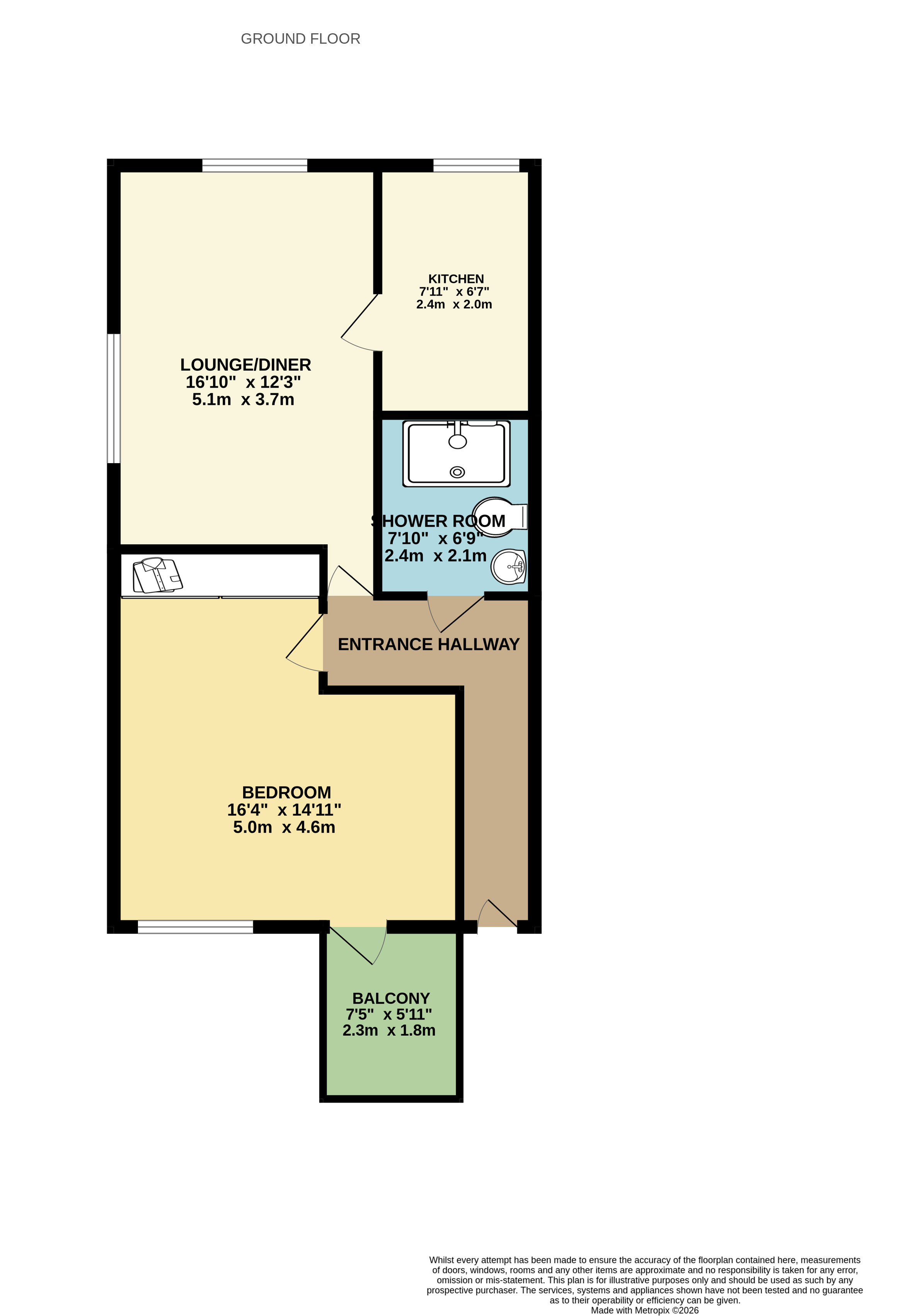The accommodation is light and well proportioned, comprising a spacious living/dining room with an abundance of natural light, a separate fitted kitchen, and a generous double bedroom benefiting from built-in wardrobes. A modern shower room completes the internal layout, providing stylish and practical facilities.