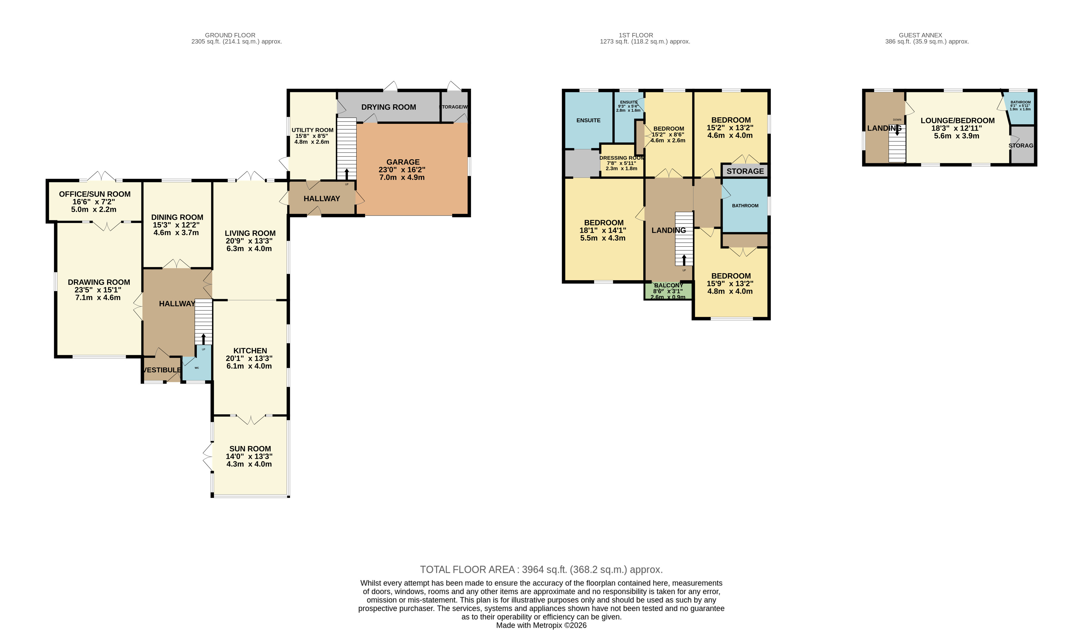 The accommodation on the ground floor briefly comprises of a bright and airy drawing room with study/office off, a spacious formal dining room, a spacious but cosy sitting room with a clear opening leading into a fitted kitchen with central island which in turn spills into the sunroom at the front. There is also a downstairs cloakroom and a good size utility room. Above the garage is a guest annex with open plan lounge/bedroom, modern bathroom plus dining area.